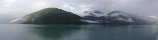 Keywords: alaska open water mountains ocean fog rainy day