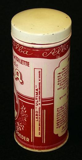 Keywords: Alba baby & toilet poeder blikje, foto2.JPG Very old Dutch product that is not produced and/or not sold any more own 2014-03-14 11 11 01 Alf van Beem CC-zero Trademarked Talcum powder tins