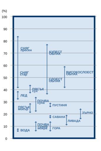 MAKE A MEME View Large Image Albedo diagram.svg en Albedo - Percentage of reflected sun light in relation to the various surface conditions of the Earth bg Албедо - п оцент на от азената слънчева светлина от  азлични ...