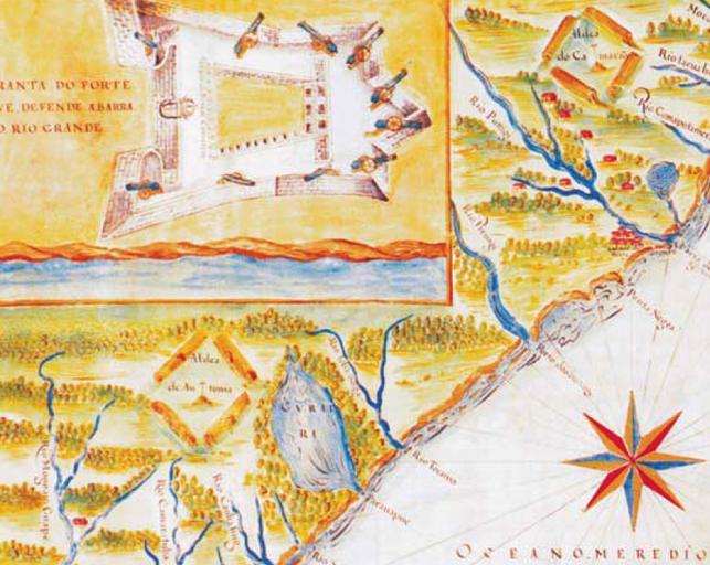 | Keywords: Albernaz-ForteReisMagos.jpg en Detail of an early 17th-century map of Rio Grande do Norte in colonial Brazil showing the Reis Magos Fortress Livro que dá Razão ao Estado do Brazil c 1616 João Teixeira Albernaz o velho the elder ca 1616 PD-Art PD-Art Maps of Natal Rio Grande do Norte Forte dos Reis Magos Natal Maps by João Teixeira de Albernaz I 1616 maps |