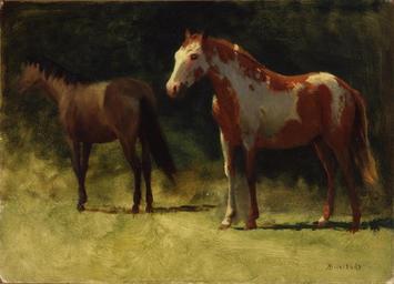 Keywords: Albert Bierstadt - Two Horses.jpg Artwork Creator Albert Bierstadt oil paper cardboard in 13 875 19 625 Institution Buffalo Bill Historical Center Whitney Gallery of Western Art Collection object history credit line Gift of Carman H Messmore signet ABierstadt In preparation for his large landscapes Bierstadt made many small sketches and studies accession number 4 62 http //old bbhc org/collections/bbhc/WG_ObjectPage cfm museum WG VarObjectKey 47035 Whitney Gallery of Western Art PD-old-100 Paintings of animals by Albert Bierstadt Paintings in the Buffalo Bill Historical Center Paintings of horses