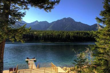 Keywords: alberta canada mountains lake water forest trees pier deck nature outside summer spring scenic woods