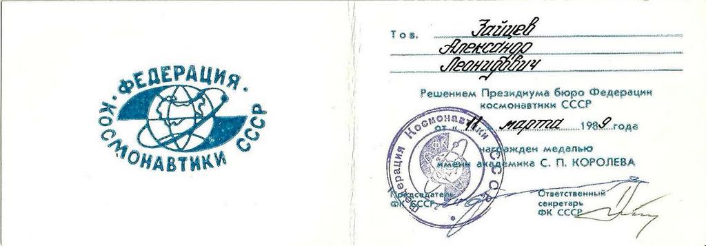 Keywords: Aleksandr Leonidovich Zaitsev Медаль Королева.jpg ru едаль Ко олева 2011-09-09 from Aleksandr Leonidovich Zaitsev Феде ация космонавтики СССР PD-RU-exempt Space program of the Soviet Union and Russia Aleksandr Leonidovich Zaitsev