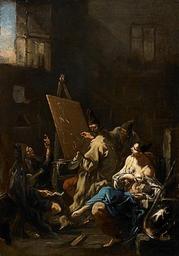 Keywords: Alessandro Magnasco - The Painter’s Workshop or Il pittor pitocco.jpg Artwork creator Alessandro Magnasco 1722-1723 Oil on canvas size cm 60 5 42 5 Private collection object history credit line accession number http //www canesso com/Alessandro-Magnasco-Genoa-1667-1749-The-Painter E2 80 99s-Workshop-pittor-pitocco-DesktopDefault aspx tabid 6 tabindex 5 objectid 463380 PD-old-100 Paintings by Alessandro Magnasco 1700s paintings from Italy Paintings of artists in the studio |