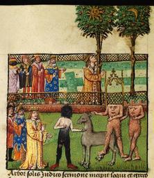 Keywords: Alexander and his companions consult the prophetic trees of the Sun and the Moon; Alexander meeting a black-legged monster man, a horse-lion and headless men (f. 84v.).jpg en Alexander and his companions consult the prophetic trees of the Sun and the Moon; Alexander meeting a black-legged monster man a horse-lion and headless men f 84v Late 15th Century Illumination on parchment Institution National Library of Wales Peniarth MS 481D object history credit line From Latin text of Historia de preliis Alexandri Magni ˜The History of Alexander ™s Battles ™ J1 version based on a 10th century translation into Latin by Leo of Naples of a Greek text ff 30-98 accession number This digital image can be seen in its original context http //www llgc org uk/digitalmirror/pei/PEI00002/index html lng en here Cc-zero Uploaded with UploadWizard Images uploaded as part of NLW - WMUK collaboration Miniatures of Alexander the Great Flemish paintings Welsh manuscripts Peniarth 481D 084v |