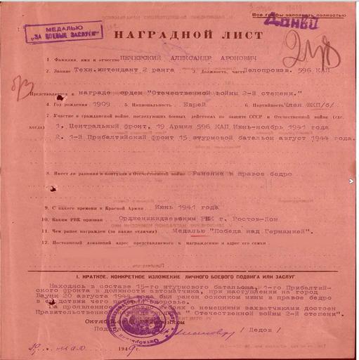 | Keywords: Alexander Pechersky medal document 1.jpg П едставление Alexander Pechersky к о дену «Отечественная война II степени» Элект онный банк данных «Подвиг на ода» 1949 Октяб ьский айвоенком Ростов-на-Дону СССР подполковник Дедов PD-RU-exempt Alexander Pechersky Uploaded with UploadWizard Survivors of Sobibór extermination camp |