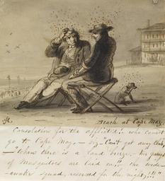 Keywords: Alfred Jacob Miller - Beach at Cape May - Walters 372675.jpg Cape May New Jersey is among the oldest American seaside resorts hosting vacationers from the mid-Atlantic region from the 18th century forward In this drawing Miller pokes gentle fun at leisure travelers Two men seated on folding stools sit on the sand despite clouds of annoying insects The caption reads Consolation for the afflicted -who cannot go to Cape May -viz- Can't get away Club - when there is a land breeze -two gangs of mosquitoes are laid on -the wide-awake squad reserved for the night ca 1840 ink wash paper cm 11 7 15 3 accession number 37 2675 12752 Mr and Mrs Decatur H Miller date and mode of acquisition unknown Walters Art Museum Gift of Mr and Mrs Decatur H Miller 1994 Title Beach at Cape May; Label Consolation for the afflicted -who cannot go to Cape May-viz-cant away club when there is a land breeze-two gangs of mosquitoes are laid on us the wide awake squad reserved for the night ; Signature Monogram lower left AJM The Recollections of Alfred Jacob Miller The Walters Art Gallery Baltimore 1996-1997 Recollections of a Baltimore Artist Sketches by Alfred Jacob Miller 1810-1874 The Walters Art Museum Baltimore 2004 place of origin USA Walters Art Museum license 2D Alfred Jacob Miller 1840 works in the United States Drawings in the Walters Art Museum New Jersey in art Mosquitos in art Black and white drawings of men Cape May New Jersey Drawings of dogs |
