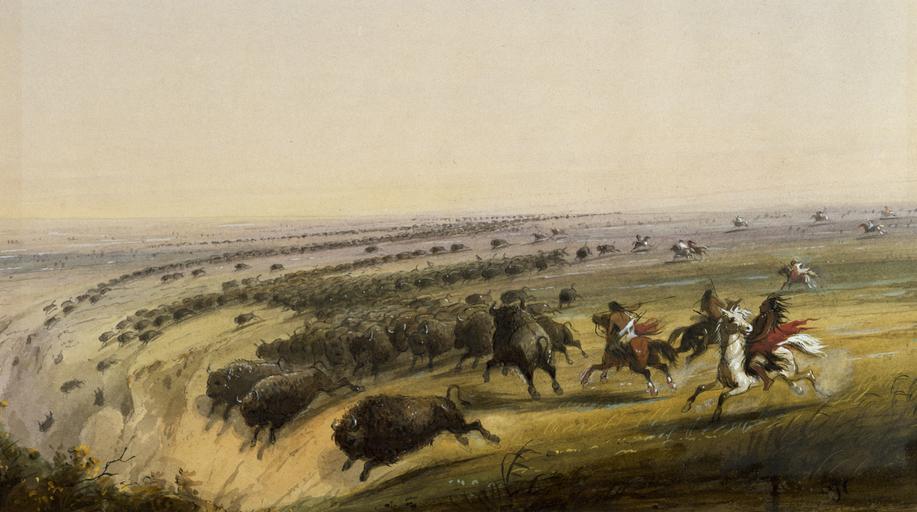 Keywords: Alfred Jacob Miller - Hunting Buffalo - Walters 371940190.jpg It is true that various Plains Indians would occasionally chase buffalo over a small cliff but Miller probably never saw this scene and therefore exaggerated it a bit The Indians when they found a suitable bluff would conceal themselves behind the rocks with hides When the herd would start to move towards the bluff the Indians would jump up from behind their rocks shouting and waving the hides keeping the buffalo moving toward the cliff In later versions of this picture Miller exaggerated the cliff even more Had the Indians driven buffalo over such precipices the meat would have been too badly smashed to eat and the bones would have been broken between 1858 1860 watercolor paper cm 21 1 36 accession number 37 1940 190 16002 William T Walters Baltimore 1858-1860 by commission Henry Walters city Baltimore Walters Art Museum Henry Walters Commissioned by William T Walters 1858-1860 Alfred Jacob Miller An Artist on the Oregon Trail Alfred Jacob Miller Maryland and the West The Walters Art Gallery Baltimore; Frostburg State University Frostburg; Jewish Community Center of Greater Washington Rockville; Washington College Chestertown 1988 place of origin USA Walters Art Museum license 2D Alfred Jacob Miller An Artist on the Oregon Trail 19th-century watercolor paintings in the United States Bisons in art Buffalo jumps Horses of Native Americans in art Hunting by horse in paintings Paintings of Native Americans by Alfred Jacob Miller Paintings by Alfred Jacob Miller in the Walters Art Museum |