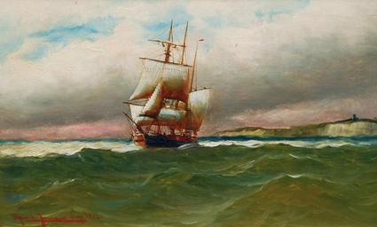 | Keywords: Alfred Jensen - Dreimaster im englischen Kanal (1912).jpg Alfred Jensen 1859-1935 date 1912 oil canvas cm 23 5 35 5 accession number object history credit line sign Alfred Jensen 1912 lower left http //www auktionshaus-stahl de/304/items/dreimaster-im-englischen-kanal-146 html Auktionshaus Stahl PD-old-auto-1923 1935 Alfred Jensen marine painter Oil paintings of seascapes 20th-century sailing ships in paintings 1912 paintings Images from Auktionshaus Stahl | ||||