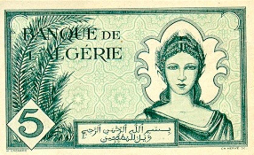Keywords: AlgeriaP91-5Francs-1942 b.jpg es 5 francos Ron Wise's World Paper Money http //aes iupui edu/rwise Banque d'Algérie banknote Ron Wise photo 1942 Banque d'Algérie banknote Ron Wise photo photo GFDL cc-by-3 0 banknote PD-Algeria Algerian franc banknotes 1942 banknotes Banknotes with a face value of 5 Green banknotes |