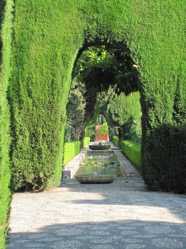 Keywords: alhambra fountain water garden hedges green hedge nature neo-classical architecture historic arch doorway