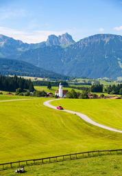 Keywords: allgäu ostallgäu bavaria mountains alpine mountain range eisenberg bavarian alps nature landscape forest summer idyll vertical germany meadow europe church steeple village outlook tree grass green trail away