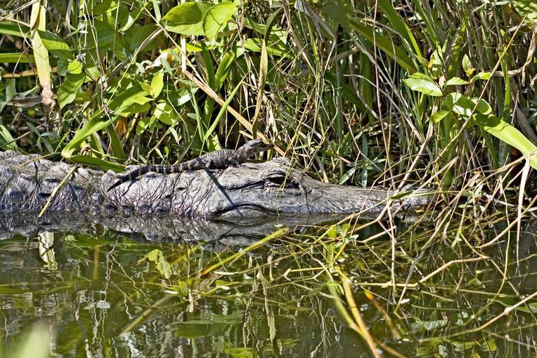 Keywords: alligator water swamp young baby adult sunning reptile wildlife gator outdoors animal nature predator resting amphibian wild