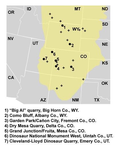 Keywords: Alloquarry copy.png Map of allosaur quarry locations in the Morrison Formation made using Image Blank US Map svg as a base; locations after Turner and Peterson 1999 Own 2007-11-09 J Spencer self Allosaurus Morrison Formation