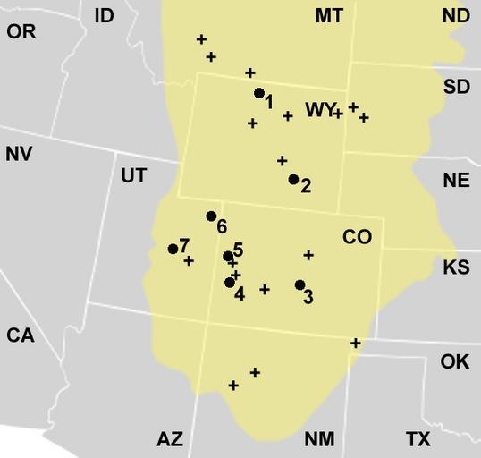 | Keywords: Alloquarrynolang.png Map of Morrison Formation allosaur quarry locations made using Blank US Map svg as a base with localities after Turner and Peterson 1999 In-image caption removed for interlanguage use <br /> Image key <br> The general extent of the Morrison Formation has been overlaid in yellow Historically or otherwise notable quarries where Allosaurus remains have been found include the numbered locations <br> Big Al quarry Big Horn Co WY <br> Como Bluff Albany Co WY <br> Garden Park/CaƱon City Fremont Co CO <br> Dry Mesa Quarry Delta Co CO <br> Grand Junction/Fruita Mesa Co CO <br> Dinosaur National Monument West Uintah Co UT <br> Cleveland-Lloyd Dinosaur Quarry Emery Co UT <br> Other locations where Allosaurus has been found are marked with a + Own 2007-11-11 J Spencer Allosaurus Morrison Formation |