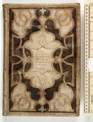| Keywords: Almagetum - Upper cover (Davis406).jpg Style Interlacing ribbon/strapwork Mottoes; Caption Upper cover; Colour White / cream; Edge Gilt and gauffered exhibition history Decorative Technique Painted; Cover Material Parchment Thin paste paper boards Pink headbands with a single bead See G D Hobson French and Italian Collectors p 33;Nixon Sixteenth century gold tooled bookbindings in the Pierpont Morgan Library; For other French 16c bindings see Marie-Pierre Laffitte Fabienne Le Bars Reliures royales de la Renaissance Paris 1999 object history Text 1528; Venice; Mahieu Thomas object type Cc-zero place of creation Binding France place of discovery Unspecified British Library image http //www bl uk/catalogues/bookbindings/LargeImage aspx RecordId 020-000004022 ImageId ImageId 41616 Copyright BL Almagetum Uploaded with GWToolset Almagetum - Upper cover Davis406 http //www webarchive org uk/bldatasets/bindings/6131_4 jpg Bookbinding 16th-century bookbinding British Library Bookbindings |