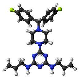 | Keywords: Almitrine-3D-balls.png Ball-and-stick model of the almitrine molecule a respiratory stimulant Colour code 505050 Carbon C black<br> F0F0F0 Hydrogen H white<br> 3C50FA Nitrogen N blue<br> C8FA00 Yellow-green Fluorine F<br> 2011-06-11 own DS Visualizer Jynto talk Space-filling version cc-zero Respiratory system drugs Monofluorobenzenes Piperazines aminotriazines Allyl compounds Images by Jynto Ball-and-stick models | ||||