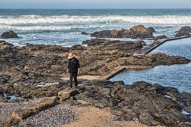 Keywords: alone beach rocks seaside sea ocean summer nature freedom peace outdoor calm relaxation woman on beach solitude vacation tranquil holiday leisure relax content herolds bay south africa