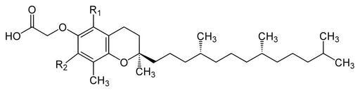 Keywords: Alpha TEA.svg en alpha TEA α-TEA; alpha-TEA; RRR-α-tocopherol ether-linked acetic acid; 2 5 7 8-tetramethyl-2R- 4R 8R 12-trimethyltridecyl chroman-6-yloxy acetic acid;<br> α R<sup>1</sup> R<sup>2</sup> CH<sub>3</sub>; β R<sup>1</sup> CH<sub>3</sub> R<sup>2</sup> H; γ R<sup>1</sup> H R<sup>2</sup> CH<sub>3</sub>; δ R<sup>1</sup> R<sup>2</sup> H de äh siehe oben Own Yikrazuul 2008-11-14 Vitamin E |