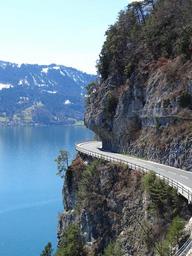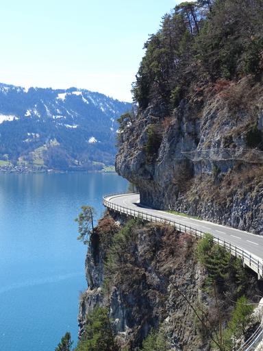 Keywords: alpine mountains mountain road gebrige rock rock slope lake trees nature beautiful landscape road mountain landscape switzerland panorama ausblik swiss alps bergsee summer steep slope