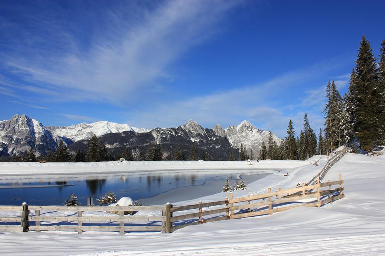 Keywords: alpine winter fence lake snow mountains austria panorama tyrolean alps distant view ski area wintry mountain panorama mountain range