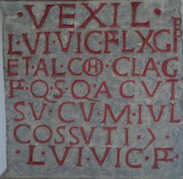 | Keywords: Altair dedicated to Jupiter and Hercules Saxanus dedicated by Marcus Julius Cossutius (fragment).jpeg la I ovi O ptimo M aximo E t HER culi SAX ano VEXIL arii L egionis VI VIC tricis P iae F idelis L egionis X G eminae P iae F idelis ET AL arum COH ortium CLA ssis G ermanicae P iae F idelis Q ui S ub Q uinto ACVT io SV nt CV ra M arci IVL ii COSSVTI > centurionis L egionis VI VI tricis P iae F idelis de Weihaltar des Marcus Julius Cossutius für Juppiter und Hercules Saxanus aus dem Brohtal Fragment Bonn Rheinisches Landesmuseum Kopie in Saalburg Hessen Datierung nach den aufgeführten Legionen 101/102 n Chr pl Ołtarz poświęcony Jowiszowi i Herkulesowi Saxanus z doliny Brohlbachu Fragment Bonn Rheinisches Landesmuseum Kopia w Saalburgu Datowanie według wymienionych legionów ok roku 101/102 NE 2015-08-23 own A photography taken in Saalburg Saper other versions cc-zero Uploaded with UploadWizard Ancient Roman inscriptions in Bonn |