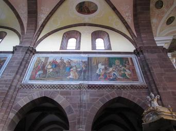 Keywords: Altorf StCyriaque055.JPG fr Alsace Bas-Rhin Altorf Abbaye Saint-Cyriaque Détail des fresques 2011-02-23 own Rh-67 cc-by-sa-3 0 Artwork / Œuvre d'art / Kunstwerk fresco canvas 280 cm de large Abbatiale Saint-Cyriaque d'Altorf Nef IM67016964 object history Trois de ces peintures datant de la campagne de travaux des années 20-30 du 18e siècle ont été fortement restaurées et en grande partie repeintes vraisemblablement par Ignace Schott de Saverne dont on pense pouvoir reconnaître la main après leur redécouverte en 1861 lorsqu'on supprima le badigeon sur les colonnes et les pierres de taille dans la nef la quatrième près de la chaire seulement en 1878 Selon le curé Sattler elles auraient été badigeonnées à la Révolution other versions Ralph Hammann PD-old accession number Uploaded with UploadWizard Photographs of Altorf by Ralph Hammann Taken with Canon PowerShot SX20 IS Nave of Saint Cyriaque Church Altorf Frescos in Bas-Rhin Baroque frescos in Alsace 18th-century church paintings in Alsace 18th-century frescos in Alsace Altorf 19th-century church paintings in Alsace 19th-century frescos in Alsace Altorf Saint Cyriacus Details of frescos 1861 works in Alsace |