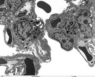 Keywords: Alveolar sac region of the lung - TEM.jpg Transmission electron microscope image of a thin section cut through the alveolar sac region of the lung mouse The alveolar cell shown has vesicles which contain surfactant a macroaggregate of phosolipids and proteins which help with breathing The surfactant is released by exocytosis and forms a thin monolayer on the wall of the alveoli This layer can't be seen in a TEM image because no fixative adequately preserves it but it can be seen inside the surfactant vesicles in the cytoplasm This layer helps to reduce surface tension thereby preventing collapse of the alveoli during exhalation and reduces the energy needed during inhalation The capillaries contain red blood cells The capillary lining consists of long thin endothelial cells connected by tight junctions JEOL 100CX TEM http //remf dartmouth edu/imagesindex html http //remf dartmouth edu/images/mammalianLungTEM/source/14 html Louisa Howard Michael Binder PD Louisa Howard and Michael Binder Cell biology |