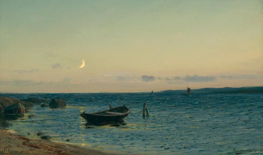 | Keywords: Amaldus Nielsen - Kveld ved sjøen (1909).jpg title Kveld ved sjøen 27 x 46cm http //www blomqvist no/auksjoner/ www blomqvist no Creator Amaldus Nielsen oil on canvas 1909 PD-old-auto 1932 Seascape paintings by Amaldus Nielsen Rowboats in art Moon rising in art 1909 paintings in Norway 20th-century oil on canvas paintings of landscape in Norway |