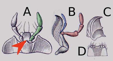 | Keywords: Amara fulva Reitter.png en mouthparts of Amara fulva from Edmund Reitter Fauna Germanica I Band Stuttgart 1908 Tafel 21 new arranged partly couloured and differently sized A mentum and labrum with labialpalps green labial palpus red tip of mentum B maxilla with outer maxillar palp red and inner maxillar palp blue ; C mandible D labrum de Mundwerkzeuge von Amara fulva nach Edmund Reitter Fauna Germanica I Band Stuttgart 1908 Tafel 21 figur 4 d e f g neu angeordnet und beschriftet teilweise koloriert Größenverhältnisse der Figuren zueinander geändert A Kinn und Unterlippe mit Lippentaster grün Pfeil auf Kinnzahn B Unterkiefer mit äußerem rot und innerem blau Kiefertaster C Oberkiefer D Oberlippe Edmund Reitter Fauna Germanica I Band Stuttgart 1908 Tafel 21 Edmund Reitter Fauna Germanica I Band Stuttgart 1908 Tafel 21 1908 PD-old |
