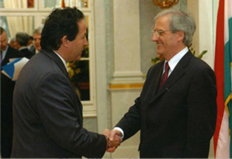 | Keywords: Ambassador Bernard Leclerc.PNG en His Excellency Bernard Leclerc Ambassador Extraordinary and Plenipotentiary of the Central African Republic left shaking hands with the President of Hungary The photograph was taken at the presentation of credentials which is a ceremony all Ambassadors take part in on arrival in the host country own Palacehistorian 2005-05-25 Bernard Leclerc Diplomatic Reception Room László Sólyom | ||||