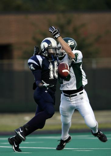 Keywords: american football defense offense game play team uniform high school players competition pass play break up battle sports football