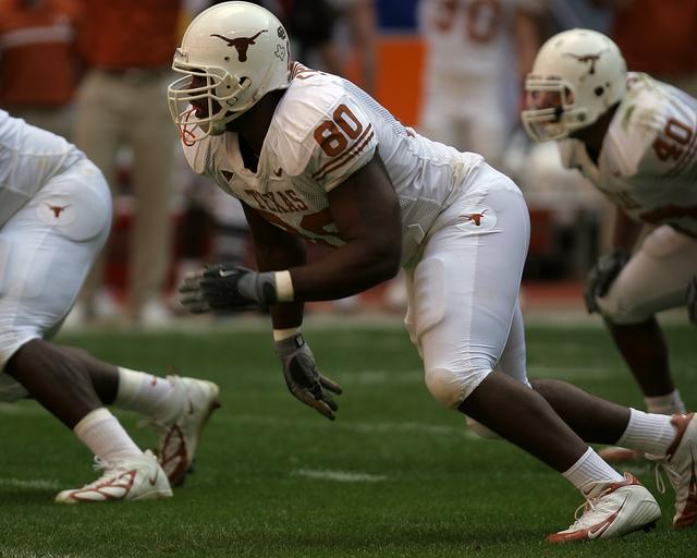 Keywords: american football defensive end defender defense football sport team end field play competition player powerful muscular intimidating action motion male texas texan college football university champion active playing game activity grass outdoors green attacker