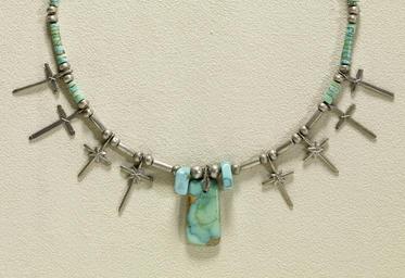 Keywords: American - Necklace with Turquoise - Walters 57992 - Detail.jpg This appealing silver and turquoise Pueblo necklace is of a style popular during the late 19th and early 20th centuries The necklace consists of turquoise and silver beads with silver cross pendants Christianity was introduced to the area by Franciscan priests from Spain; the necklace is reminiscent of the Spanish Catholic rosary early Other date century 20 turquoise silver cm 25 5 accession number 57 992 2260 Arizona Henry Walters Baltimore 1916 mode of acquisition unknown Walters Art Museum Henry Walters Acquired by Henry Walters 1916 Bedazzled 5 000 Years of Jewelry from the Walters Art Museum Frist Center for the Visual Arts Nashville; The John and Mable Ringling Museum of Art Sarasota; The Walters Art Museum Baltimore 2006-2009 Bedazzled 5 000 Years of Jewelry El Paso Museum of Art El Paso 2010 place of origin southwest USA Walters Art Museum license Native American jewellery Jewellery of the United States Turquoise jewellery Cross chains Pueblo people 20th-century art in the United States Jewellery in the Walters Art Museum Crosses in jewellery |