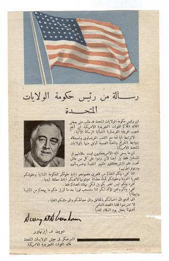 | Keywords: American to Arabs WW II.jpg en In an attempt to sway both the Vichy French and the North African natives to the Allied cause thousands of leaflets were dropped over North Africa prior to the landings in November 1942 This leaflet was picked up in Oran Algeria by Oscar Rich who landed there as a member of the 1st Quartermaster Battalion 1st Infantry Division The leaflet printed in French on one side and Arabic on the other reads in part Message from the President of the United States We come to you to liberate you from your conquerors whose only desire is to deprive you of your sovereign right to worship freely and your right to live your way of life in peace We come to you solely to defeat your enemies “ we wish you no harm We come to you with the assurance that we will leave as soon as the menace of Germany and Italy is dissipated Help us and the day of universal peace will arrive 2014-06-21 13 48 37 http //www nww2m com/wp-content/uploads/2012/10/Message-2-663x1024 jpg American Psy ops WW II Custom license marker 2014 06 21 PD-USGov Uploaded with UploadWizard Psychological warfare in Egypt during WW II Ser Askar Military rank |