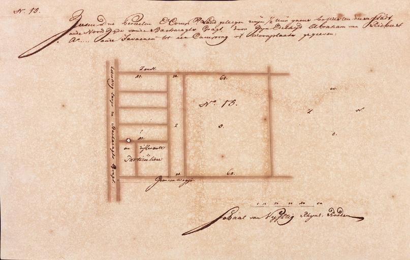 | Keywords: AMH-6049-NA Map of farmlands in the Batavia area, part fifteen.jpg Artwork nl Kaart van landerijen in de omgeving van Batavia deel vijftien nl Titel catalogus Leupe NA Zeekere drie perceelen E Compagnie's land geleegen ruijm 1/2 uur gaans bewesten deese stadt an de noordzijde van de Bacharagtsgragt door Z E Abraham van Riebeek a an de Javaenen tot een campong of woonplaats gegeeven Het kaartje maakt deel uit van een verzameling van 24 kaartjes en is genummerd no 15 linksboven en in het midden N 15 De nummers 11 20 21 en 26 ontbreken Rechts een kompas Z;W;N;O en onderin een schaalverdeling Schaal van Vijftig Rhijns Roeden In het midden bevindt zich een kaart met wegen en grachten zoals heereweg langs de Bacharagts Gragt gemeen wegje an differente particuliere en Title in the Leupe catalogue NA Zeekere drie perceelen E Compagnie's land geleegen ruijm 1/2 uur gaans bewesten deese stadt an de noordzijde van de Bacharagtsgragt door Z E Abraham van Riebeek a an de Javaenen tot een campong of woonplaats gegeeven The map is part of a collection of 24 charts and is numbered no 15 top left and in the centre N 15 The numbers 11 20 21 and 26 are missing To the right a compass Z;W;N;O and at the bottom a scale Schaal van Vijftig Rhijns Roeden In the centre a map of roads and canals comprising heereweg langs de Bacharagts Gragt gemeen wegje an differente particuliere Atlas of Mutual Heritage na http //www atlasofmutualheritage nl/en/object/ id 6049 Source at the Atlas of Mutual Heritage - http //www gahetna nl/collectie/archief/inventaris/index/eadid/4 VELH/inventarisnr/452 15/level/file Source at the Nationaal Archief en Subjects compass / dial bridge estate / plantation chart / map / plan nl Onderwerpen kompas / windroos brug landerij / plantage plattegrond / kaart en Post this image is related to a VOC trading post called http //www atlasofmutualheritage nl/en/post/ id 328 Jakarta Inscription Zeekere Drie Perceelen E Comp Land geleegen ruym 1/2 uur gaans beWesten deese Stadt ande Noord Zyde vande Bacharagts Gragt door Zyn Edelhyd Abraham van Riebeek A ande Javaanen tot een Campong of woonplaats gegeeven nl between 1689 1709 nl Anoniem / Anonymous en Anoniem / Anonymous Institution Nationaal Archief nl pen en penseel op papier en pen and brush on paper Size cm 26 5 42 accession number NL-HaNA_4 VELH_452 15 old number VELH0452_15 PD-Art-100 Maps of the Dutch East India Company - Indonesia |