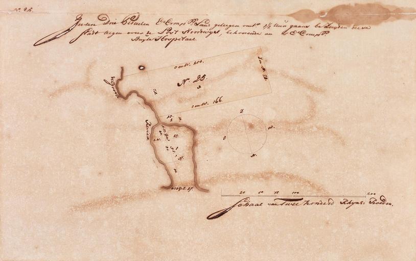 | Keywords: AMH-6057-NA Map of farmlands in the Batavia area, part twenty five.jpg Artwork nl Kaart van landerijen in de omgeving van Batavia deel vijfentwintig nl Titel catalogus Leupe NA Zeekere drie perceelen E Compagnie's land geleegen omtrent 1 5 uur gaans bezuijden deese stadt teegenoover den post Noordwijck behoorendean 's E Comp Buijtehospitaal Het kaartje maakt deel uit van een verzameling van 24 kaartjes en is genummerd no 25 linksboven en in het midden N 25 De nummers 11 20 21 en 26 ontbreken Op de afbeelding een plattegrond met de termen de Groote Revier Rechts een kompas N O Z W en onder een schaalverdeling Schaal van Tweehonderd Rhijns Roeden en Title in the Leupe catalogue NA Zeekere drie perceelen E Compagnie's land geleegen omtrent 1 5 uur gaans bezuijden deese stadt teegenoover den post Noordwijck behoorendean 's E Comp Buijtehospitaal The map is part of a collection of 24 charts and is numbered no 25 top left and in the centre N 25 The numbers 11 20 21 and 26 are missing Depicted is a map containing the label de Groote Revier Right a compass N O Z W and below a scale Schaal van Tweehonderd Rhijns Roeden Atlas of Mutual Heritage na http //www atlasofmutualheritage nl/en/object/ id 6057 Source at the Atlas of Mutual Heritage - http //www gahetna nl/collectie/archief/inventaris/index/eadid/4 VELH/inventarisnr/452 25/level/file Source at the Nationaal Archief en Subjects compass / dial chart / map / plan estate / plantation nl Onderwerpen kompas / windroos plattegrond / kaart landerij / plantage en Fort this image is related to a VOC fort called http //www atlasofmutualheritage nl/en/fort/ id 48 fort Noortwijck Inscription Zeeker Drie Perceelen E Comp Land geleegen omtrent 1 5 Uur gaans beZuyden deese Stadt teegen oover de Post Noordwijck behoordende an 's E Comp Buyten Hospitaal nl between 1689 1709 nl Anoniem / Anonymous en Anoniem / Anonymous Institution Nationaal Archief nl pen en penseel op papier en pen and brush on paper Size cm 27 42 5 accession number NL-HaNA_4 VELH_452 25 old number VELH0452_25 PD-Art-100 Maps of the Dutch East India Company - Indonesia |