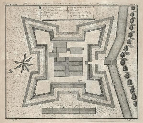 | Keywords: AMH-7048-KB Map of the fort of Jacatra near Batavia.jpg Artwork nl Plattegrond van het fort Jacatra bij Batavia nl Plattegrond van het fort Jacatra bij Batavia Plan oder Grundriss des Forts Jacatra eine Stund von Batavia gelegen Linksboven No XXXVIII Rechtsboven pag 112 Legenda a des Officiers Wohnung / b Logies derer Sergeanten / c die Wacht oder des Volcks Logis / d Chirurgi Wohnung / e Constablers Wohnung / f Kochs Logis / g der Eingang oder das Thor / h Brücke worauf ein Heck oder Gatter / i die Revier / k der Abtrit vor das Volck / l Hecke oder Haag um das Fort / m der Weg nach Batavia / n Plan vom Glocken-Thurm en Map of the fort of Jacatra near Batavia Plan oder Grundriss des Forts Jacatra eine Stund von Batavia gelegen Top left No XXXVIII Top right pag 112 Key a des Officiers Wohnung / b Logies derer Sergeanten / c die Wacht oder des Volcks Logis / d Chirurgi Wohnung / e Constablers Wohnung / f Kochs Logis / g der Eingang oder das Thor / h Brücke worauf ein Heck oder Gatter / i die Revier / k der Abtrit vor das Volck / l Hecke oder Haag um das Fort / m der Weg nach Batavia / n Plan vom Glocken-Thurm Atlas of Mutual Heritage kb http //www atlasofmutualheritage nl/en/object/ id 7048 Source at the Atlas of Mutual Heritage en Subjects chart / map / plan compass / dial key banderole / cartouche / ornamentation bridge fortification building fence / kraal tower nl Onderwerpen plattegrond / kaart kompas / windroos legenda banderol / cartouche / versiering brug vesting gebouw omheining / kraal toren en Fort this image is related to a VOC fort called http //www atlasofmutualheritage nl/en/fort/ id 46 fort Jacatra Inscription Plan oder Grundriss des Forts Jacatra eine Stund von Batavia gelegen author J W Heijdt del / A Hoffer sculp nl circa 1744 Creator Johann Wolfgang Heydt Creator Andreas Hoffer Creator Johann Carl Tetschner nl Johann Wolfgang Heydt tekenaar Andreas Hoffer graveur / etser Johann Carl Tetschner uitgever en Johann Wolfgang Heydt draughtsman Andreas Hoffer engraver / etcher Johann Carl Tetschner publisher Institution Koninklijke Bibliotheek nl koperdruk op papier en copperplate printing on paper Size cm 25 29 accession number 2102 A 7 p 112 PD-Art-100 Fort Jacatra Maps of the Dutch East India Company - Indonesia 1744 Indonesia in the 18th century |
