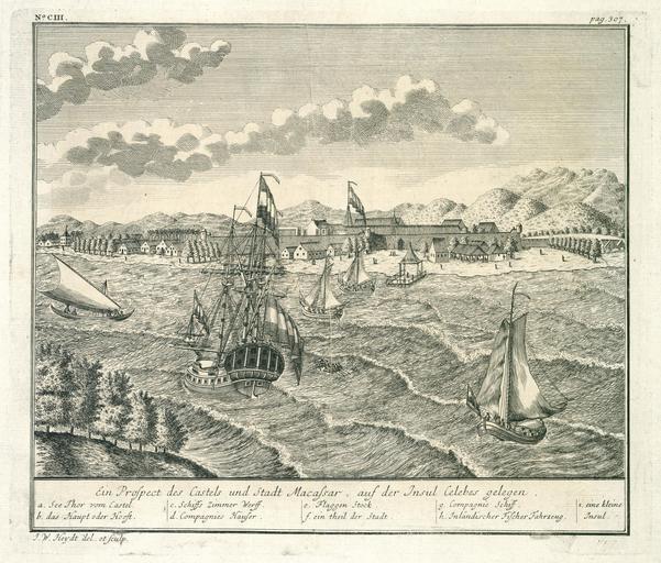 Keywords: AMH-7110-KB View of the city and the fort of Macassar.jpg Artwork nl Gezicht op de stad en het fort Macassar nl Gezicht op de stad en het fort Macassar Ein Prospect des Castels und Stadt Macassar auf der Insul Celebes gelegen Linksboven No CIII Rechtsboven pag 307 Legenda a See Thor vom Castel / b das Haupt oder Hooft / c Schiffs Zimmer Werff / d Compagnies Häuser / e Flaggen Stock / f ein theil der Stadt / g Compagnie Schiff / h Inländischer Fischer Fahrzeug / i eine kleine Insul en View of the city and the fort of Macassar Ein Prospect des Castels und Stadt Macassar auf der Insul Celebes gelegen Linksboven No CIII Rechtsboven pag 307 Legenda a See Thor vom Castel / b das Haupt oder Hooft / c Schiffs Zimmer Werff / d Compagnies Häuser / e Flaggen Stock / f ein theil der Stadt / g Compagnie Schiff / h Inländischer Fischer Fahrzeug / i eine kleine Insul Atlas of Mutual Heritage kb http //www atlasofmutualheritage nl/en/object/ id 7110 Source at the Atlas of Mutual Heritage en Subjects survey / view anchorage / pier / harbour ship / vessel key fortification house shipyard gate Person building nl Onderwerpen overzicht / aanzicht rede / haven / pier schip / vaartuig legenda vesting huis / woonhuis scheeps- / timmerwerf poort Persoon gebouw en Post this image is related to a VOC trading post called http //www atlasofmutualheritage nl/en/post/ id 344 Makassar Inscription Ein Prospect des Castels und Stadt Macassar auf der Insul Celebes gelegen author J W Heydt del et sculp nl between 1735 1744 Creator Johann Carl Tetschner Creator Johann Wolfgang Heydt nl Johann Carl Tetschner uitgever Johann Wolfgang Heydt tekenaar en graveur en Johann Carl Tetschner publisher Johann Wolfgang Heydt draughtsman and engraver Institution Koninklijke Bibliotheek nl koperdruk op papier en copperplate printing on paper Size cm 24 5 29 accession number 2102 A 7 p 307 PD-Art-100 Dutch East India Company 1730s |