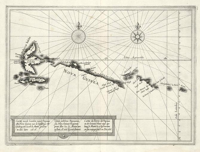 | Keywords: AMH-8127-KB Map of New Guinea and Gilolo.jpg Artwork nl Kaart van Nieuw Guinea en Gilolo nl Kaart van Nieuw Guinea en Gilolo Caerte vande Landen vande Papouas ofte Nova Guinea nae de beseijlinge en ontdecking van Iacob le Maire gedaen in den Iare 1616 De reis van Schouten en Le Maire werd in 1615 uitgerust door de vader van Le Maire voor de Australische Compagnie Deze compagnie probeerde het octrooi van de VOC te omzeilen door een andere route naar Indonesiƫ te vinden Dit lukte Schouten en Le Maire door om Vuurland heen te zeilen in plaats van door de straat Magelaen Ondanks hun ontdekkingen was hun reis niet erg succesvol eenmaal in Batavia werden ze niet geloofd en het overgebleven schip de Eendracht werd met lading in beslag genomen Schouten en Le Maire ontdekten de Willem Schouten Eilanden ten noorden van Nieuw Guinea Op de kaart is de route van Schouten en Le Maire ingetekend Cf Universiteitsbibliotheek Amsterdam inv nr OK 80 647 na p 169 en Map of New Guinea and Gilolo Caerte vande Landen vande Papouas ofte Nova Guinea nae de beseijlinge en ontdecking van Iacob le Maire gedaen in den Iare 1616 The expedition undertaken by Schouten and Le Maire was equipped in 1615 by Le Maire's father for the Australische Compagnie This company attempted to circumvent the VOC patent by finding another route to Indonesia Schouten and Le Maire succeeded in their quest by sailing around Vuurland instead of through the Magellan Straits But despite their discovery of a new route their expedition was not very successful When they arrived in Batavia their story was not believed and their remaining vessel the Eendracht was confiscated along with its cargo Schouten and Le Maire discovered the Willem Schouten Islands north of New Guinea This chart maps the route Schouten and Le Maire took Cf Universiteitsbibliotheek Amsterdam inv nr OK 80 647 after p 169 Atlas of Mutual Heritage kb http //www atlasofmutualheritage nl/en/object/ id 8127 Source at the Atlas of Mutual Heritage en Subjects chart / map / plan compass / dial banderole / cartouche / ornamentation nl Onderwerpen plattegrond / kaart kompas / windroos banderol / cartouche / versiering en Post this image is related to a VOC trading post called http //www atlasofmutualheritage nl/en/post/ id 651 Ternate Inscription Caerte vande Landen vande Papouas ofte Nova Guinea nae de beseijlinge en ontdecking van Iacob le Maire gedaen in den Iare 1616 nl 1616 Creator M Colijn nl Anoniem / Anonymous landmeter / kaartenmaker M Colijn uitgever en Anoniem / Anonymous land surveyor / mapmaker M Colijn publisher Institution Koninklijke Bibliotheek nl gravure op papier en engraving on paper Size cm 16 5 21 5 accession number 108 D 7 dl III na fol 72 PD-Art-100 Maps of the Dutch East India Company - Indonesia 1616 Jacob le Maire Willem Schouten |