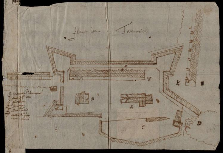 | Keywords: AMH-8573-NA Floor plan of the Tamarica fort.jpg Artwork nl Plattegrond van het fort Tamarica nl Plattegrond van het fort Tamarica Titel in Catalogus Leupe NA Plan van het Kasteel Tamarica Plant van Tamarica Legenda A-F Rechtsonder in potlood n 87 en Floor plan of the Tamarica fort Title in the Leupe Catalogue NA Plan van het Kasteel Tamarica Plant van Tamarica Key A-F Bottom right in pencil n 87 Atlas of Mutual Heritage na http //www atlasofmutualheritage nl/en/object/ id 8573 Source at the Atlas of Mutual Heritage - http //www gahetna nl/collectie/archief/inventaris/index/eadid/4 VEL/inventarisnr/702/level/file Source at the Nationaal Archief en Subjects chart / map / plan key fortification building nl Onderwerpen plattegrond / kaart legenda vesting gebouw en Post this image is related to a WIC trading post called http //www atlasofmutualheritage nl/en/post/ id 1029 Itamaracà eiland Inscription Plant van Tamarica nl circa 1630 nl Anoniem / Anonymous landmeter / kaartenmaker en Anoniem / Anonymous land surveyor / mapmaker Institution Nationaal Archief nl pen op papier en pen on paper Size cm 22 30 accession number NL-HaNA_4 VEL_702 old number VEL0702 PD-Art-100 Maps of the West-Indische Compagnie 1630 |