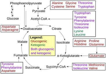 | Keywords: Amino acid catabolism revised.svg Amino acid catabolism This is a modified version of a diagram created July 2011 by Mikael Häggström and based on information in Lippincott's Illustrated Reviews Biochemistry<ref>Chapter 20 Amino Acid Degradation and Synthesis in cite book Denise R PhD Ferrier Lippincott's Illustrated Reviews Biochemistry Lippincott's Illustrated Reviews Lippincott Williams Wilkins Hagerstwon MD 0-7817-2265-9 </ref> The Lippincott's text and the original diagram contained several discrepancies when compared with 5 other prominent biochemistry textbooks This revised diagram represents consensus information from these 5 texts see References below Specific updates -There is a lack of agreement among textbooks about which amino acids enter at acetoacetate which enter at acetoacetyl CoA and which enter directly at acetyl CoA However the key point is that there are 7 amino acids that enter the TCA at acetyl CoA and the diagram has been revised to reflect this -Threonine was previously listed as glucogenic only but it is both glucogenic and ketogenic enters at acetyl CoA and has been updated accordingly -Tryptophan was listed as both glucogenic and ketogenic yet the old version of the diagram did not have it entering at any glucogenic substrate Diagram has been updated to show it enters at pyruvate -Only Phenylalanine and Tyrosine were listed as entering at Fumarate but Aspartate also does The diagram has been updated accordingly References reflist Garrett R H Grisham C M 2008 Biochemistry 5 ed Brooks Cole See p 805 Gropper S S Smith J L Groff J L 2009 Advanced Nutrition and Human Metabolism 5 ed Belmont CA Wadsworth Publishing Company Inc See p 212 Murray R K Bender D Rodwell V W Botham K M Kennelly P J Weil P A 2009 Harper's Illustrated Biochemistry 28 ed McGraw-Hill Medical See p 505 Nelson D L Cox M M 2009 Lehninger Principles of Biochemistry 5 ed W H Freeman and Company See p 688 Stipanuk M H 2006 Biochemical physiological molecular aspects of human nutrition 2 ed Saunders Elsevier See p 369 Made in Inkscape 2012-04-03 http //commons wikimedia org/wiki/File Amino_acid_catabolism svg Mikael Häggström Amino acid catabolism - versions cc-zero Amino acid metabolism |