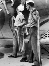 | Keywords: Ammo 30cal belt 1942.jpg U S Navy ordnancemen loading belted cartridges into a Douglas SBD-3 Dauntless at Naval Air Station in Norfolk Virginia USA in 1942 520918 ca 1942-09 U S Navy photo 80-G-472528 File Ordnancemen loading belted cartridges into SBD-3 at Naval Air Station in Norfolk Virginia - NARA - 520918 tif PD-USGov 30-06 Disintegrating ammunition belts Naval Air Station Norfolk Douglas SBD Dauntless September 1942 in the United States | ||||