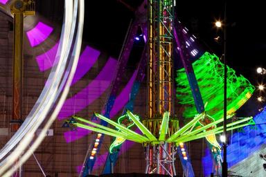 Keywords: amusement color colorful dark entertainment excitement fair ferris fun lights motion neon night park pendulum ride speed trail wheel