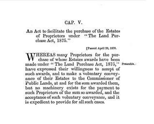 Keywords: An Act to facilitate the purchase of the Estates of Proprietors under the Land Purchase Act, 1875 (title and preamble).jpg Land Purchase Act 39th Victoria Cap 5 was a statute in Prince Edward Island Canada passed by the General Assembly of Prince Edward Island in 1876 to address the problem of absentee landowners http //books google ca/books id RkIQAAAAYAAJ pg PA59 lpg PA59 dq 22Land+Purchase+Act 22+1875+prince+edward source bl ots Ivrm17b7Ik sig I5JoYq5ec4vGDsgW3ARMrEocoFk hl en ei eCajToaIGOTF0AHJ5YjZBA sa X oi book_result ct result resnum 1 ved 0CBwQ6AEwADgK v onepage q 22Land 20Purchase 20Act 22 201875 20prince 20edward f false The acts of the General Assembly of Prince Edward Island 1876 General Assembly of Prince Edward Island 1876-04-29 PD-Old Statutes of Canada 1876 in Prince Edward Island 1876 documents |
