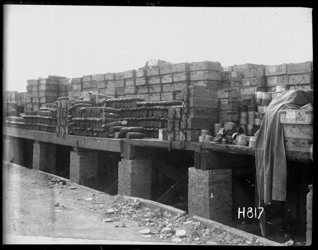 | Keywords: blackandwhite monochrome photo border outdoor black and white A general view of an ammunition store in World War I. Boxes of ammunition are piled on a raised wooden platform. Various shells are also stacked at the front. Photograph taken 1917 by Henry Armytage Sanders. Inscriptions: Inscribed - Photographer's title on negative -bottom right: H817. Quantity: 1 b&w original negative(s). Physical Description: Dry plate glass negative 4 x 5 inches An ammunition dump, World War I. Royal New Zealand Returned and Services' Association :New Zealand official negatives, World War 1914-1918. Ref: 1/2-013401-G. Alexander Turnbull Library, Wellington, New Zealand. natlib.govt.nz/records/22637868 A general view of an ammunition store in World War I. Boxes of ammunition are piled on a raised wooden platform. Various shells are also stacked at the front. Photograph taken 1917 by Henry Armytage Sanders. Inscriptions: Inscribed - Photographer's title on negative -bottom right: H817. Quantity: 1 b&w original negative(s). Physical Description: Dry plate glass negative 4 x 5 inches An ammunition dump, World War I. Royal New Zealand Returned and Services' Association :New Zealand official negatives, World War 1914-1918. Ref: 1/2-013401-G. Alexander Turnbull Library, Wellington, New Zealand. natlib.govt.nz/records/22637868 |