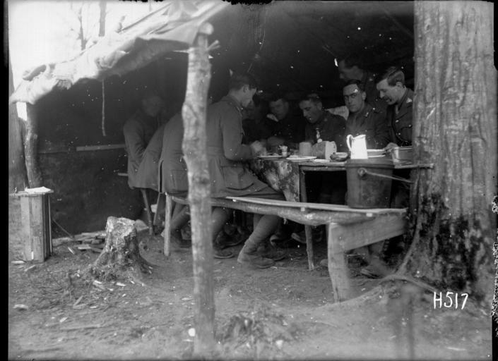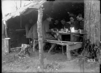 | Keywords: blackandwhite monochrome black and white New Zealand officers sit at a rough table and benches under canvas in the officers' mess in a wood near Louvencourt, France. Photograph taken 22 April 1918 by Henry Armytage Sanders. Inscriptions: Inscribed - Photographer's title on negative -bottom right: H517. Quantity: 1 b&w original negative(s). Physical Description: Dry plate glass negative 4.75 x 6.5 inches An officers' mess in the transport lines, Louvencourt. Royal New Zealand Returned and Services' Association :New Zealand official negatives, World War 1914-1918. Ref: 1/2-013135-G. Alexander Turnbull Library, Wellington, New Zealand. natlib.govt.nz/records/23236973 New Zealand officers sit at a rough table and benches under canvas in the officers' mess in a wood near Louvencourt, France. Photograph taken 22 April 1918 by Henry Armytage Sanders. Inscriptions: Inscribed - Photographer's title on negative -bottom right: H517. Quantity: 1 b&w original negative(s). Physical Description: Dry plate glass negative 4.75 x 6.5 inches An officers' mess in the transport lines, Louvencourt. Royal New Zealand Returned and Services' Association :New Zealand official negatives, World War 1914-1918. Ref: 1/2-013135-G. Alexander Turnbull Library, Wellington, New Zealand. natlib.govt.nz/records/23236973 |