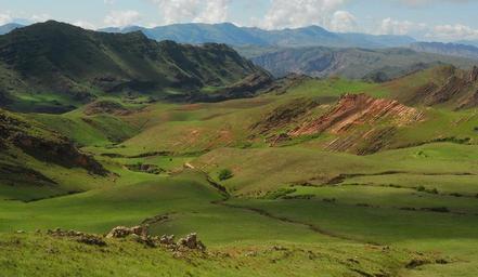 Keywords: andean landscape green mountain valley grass field peak range hill environment view tranquil countryside scene serene highlands