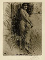 | Keywords: Anders Zorn - Nanette (etching) 1903.jpg Artwork sv Nanette en Nanette creator Anders Zorn 1903 Etching cm 20 15 http //auktionsverket se/auction/prints/2011-06-16/78-anders-zorn-1860-1920-nanette-etsning/ Stockholms Auktionsverk 1920 Etchings by Anders Zorn 1903 etchings Etchings of nude women |