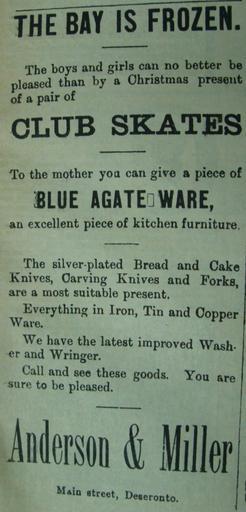 Keywords: stores skating women 1890s document text Advertisment for Anderson & Miller's store on Main Street, Deseronto, Ontario from the 9 December 1892 edition of The Tribune. The advertisement reads: THE BAY IS FROZEN The boys and girls can no better be pleased than by a Christmas present of a pair of CLUB SKATES ----- To the mother you can give a piece of BLUE AGATE WARE an excellent piece of kitchen furniture -------- The silver plated Bread and Cake Knives, Carving Knives and Forks,are a most suitable present. Everything in Iron, Tin and Copper Ware. We have the latest improved Washer and Wringer. Call and see these goods. You are sure to be pleased. --------- Anderson & Miller Main Street, Deseronto Advertisment for Anderson & Miller's store on Main Street, Deseronto, Ontario from the 9 December 1892 edition of The Tribune. The advertisement reads: THE BAY IS FROZEN The boys and girls can no better be pleased than by a Christmas present of a pair of CLUB SKATES ----- To the mother you can give a piece of BLUE AGATE WARE an excellent piece of kitchen furniture -------- The silver plated Bread and Cake Knives, Carving Knives and Forks,are a most suitable present. Everything in Iron, Tin and Copper Ware. We have the latest improved Washer and Wringer. Call and see these goods. You are sure to be pleased. --------- Anderson & Miller Main Street, Deseronto |